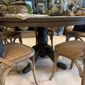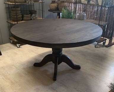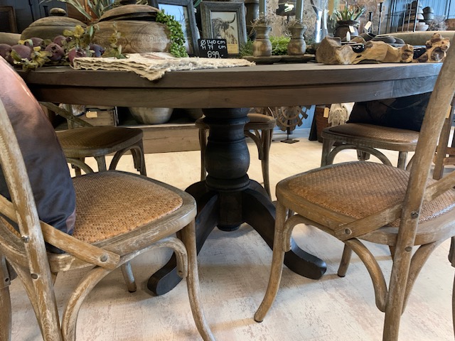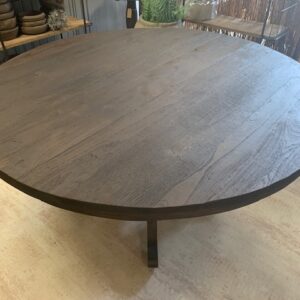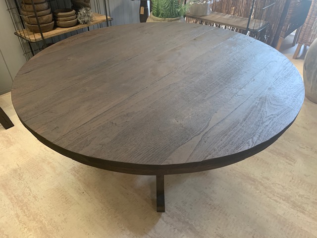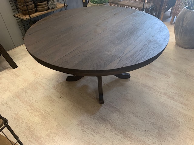 Eettafel Rond van geleefd oud hout D140cm H 77cm bovenkant blad, 73cm onderkant blad.